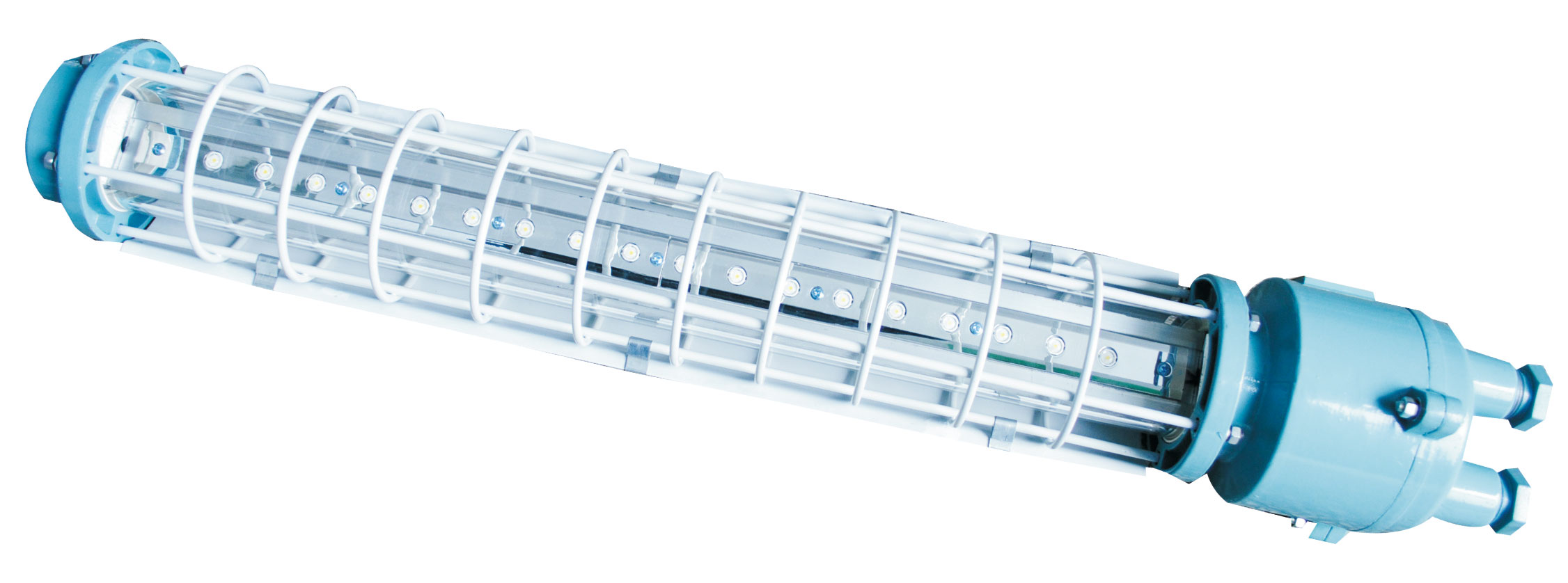 LED燈由左、右蓋及電源、光源、防爆玻璃罩、金屬防護(hù)罩等部分組成。左蓋上設(shè)有銘牌。殼體內(nèi)裝有恒壓恒流源、接線座,右蓋設(shè)有電纜引入裝置和外接地螺釘。防爆玻璃罩與左蓋、右殼體間由密封墊密封;光源連同散熱器裝在防爆波里罩內(nèi)。光源腔與接線腔,燈具內(nèi)腔與外界均有符合規(guī)定的防爆接合面防爆。